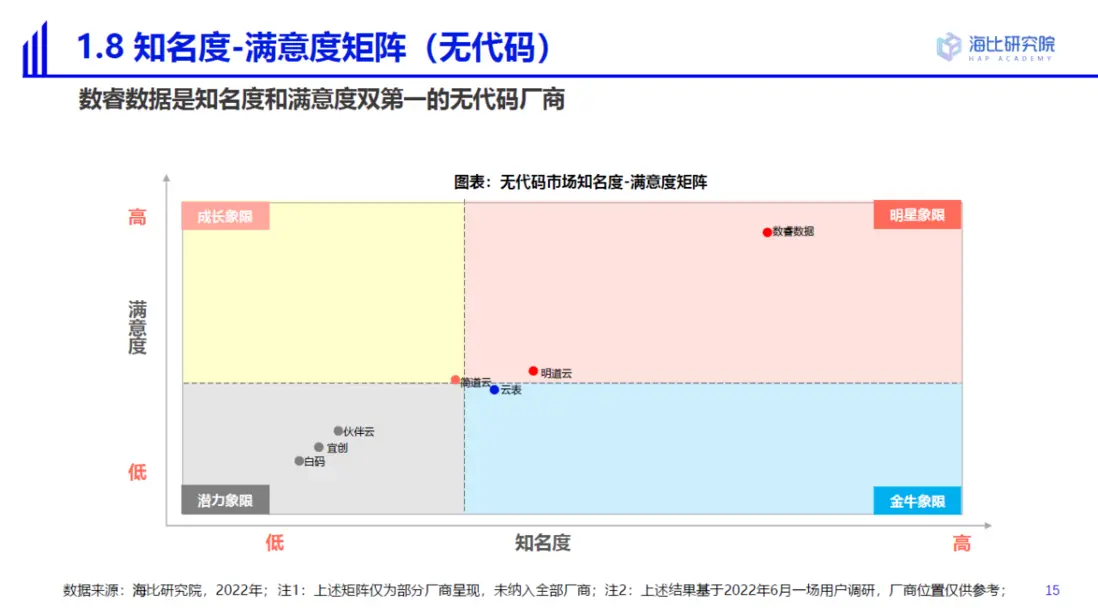 2022年,數睿數據作為中國首家數據驅動的企業級無代碼軟件平台,在無代碼廠商中獲得了知名度和滿意度雙第一。在品牌能力、產品能力、技術能力、服務能力、安全能力和價值能力方面,優勢明顯。