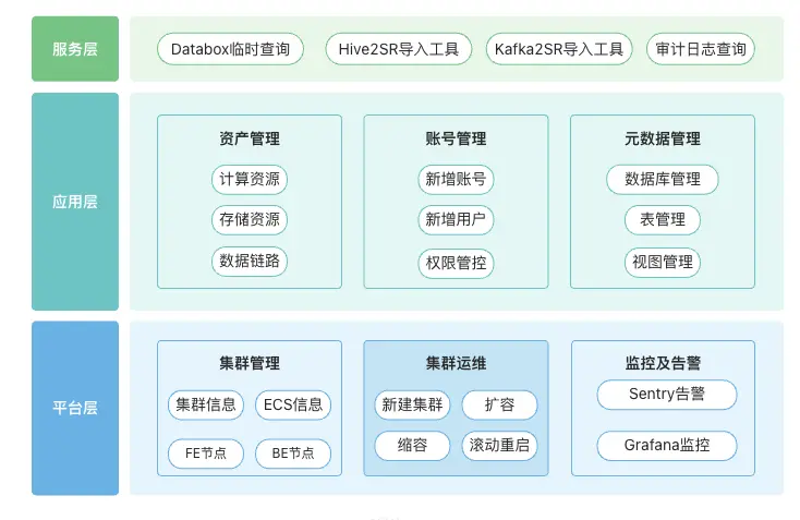 平台整體聚焦集羣管理、資產管理、權限管控及集羣服務四大關鍵領域,通過模塊化設計與標準化流程,構建起覆蓋 StarRocks 運維全生命週期的管理體系。其核心模塊包括: