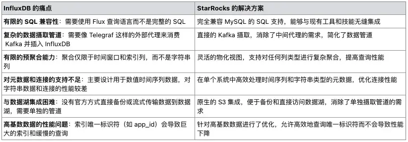 - 靈活的數據模型:相比之前基於時間序列的 InfluxDB,StarRocks 的關係型數據模型支持更復雜的查詢,同時簡化了元數據管理。