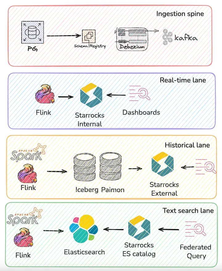 (Fresha 的高層數據流如下:以 Postgres 為主的數據源通過 Debezium + Schema Registry 接入 Kafka;計算層使用 Flink 與 Spark;湖倉層採用 Iceberg + Paimon;下游由多個 Sink 承接,其中 StarRocks 作為統一的 SQL 查詢入口。StarRocks 通過外部 Catalog 訪問湖倉數據,計算層則分別服務實時與歷史鏈路,對湖倉進行讀寫。)