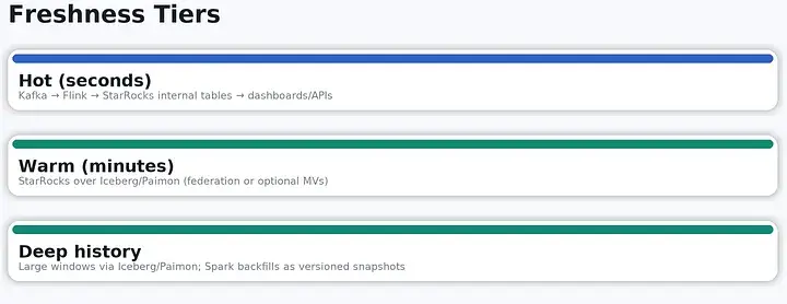 (在生產環境中按數據新鮮度做了分層:Hot(秒級)通過 Kafka → Flink → StarRocks 內部表;Warm(分鐘級)由 StarRocks 直接查詢 Iceberg/Paimon(聯邦查詢,必要時配合 MV 加速);Deep history(深度歷史)保留在 Iceberg/Paimon 中,由 Spark 以版本化快照方式進行回灌與補齊。)