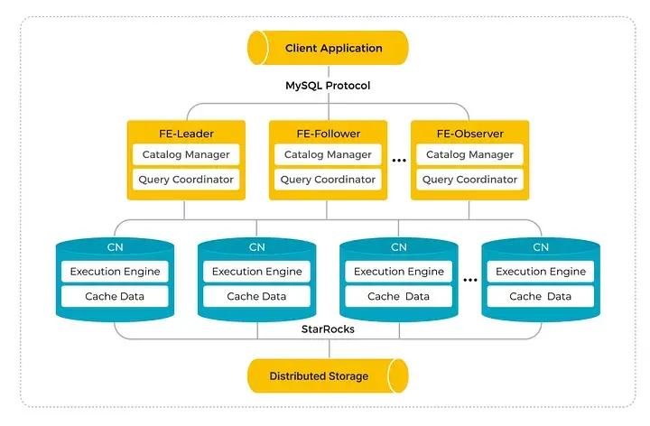 (StarRocks 採用存算分離架構:客户端通過 MySQL 協議連接到 FE 節點(Leader、Follower/Observer),由 FE 負責 Catalog 管理與查詢協調;CN 節點承擔實際查詢執行並進行數據緩存。持久化數據存放在分佈式存儲中,因此擴展算力時只需要新增 CN 節點,無需對存儲數據做重分佈。)