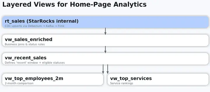 (首頁分層視圖示例:rt_sales(CDC upsert 寫入)→ vw\_sales\_enriched(業務關聯、狀態口徑、分區過濾條件,以及衍生字段/過濾字段,例如 day、is\_eligible、provider\_bucket)→ vw\_recent\_sales → vw\_top\_*。)