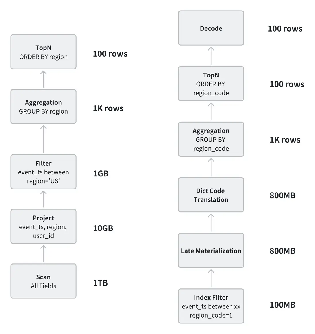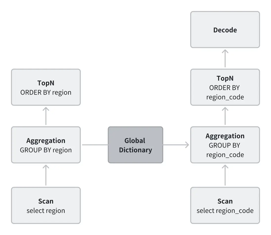 例如,原本的 GROUP BY region 操作需要在哈希表中頻繁進行字符串查找和更新;使用全局字典後,執行計劃可改寫為 GROUP BY region_code,以整數完成聚合,僅在最終輸出階段再將整數解碼為字符串,從而顯著減少計算開銷。