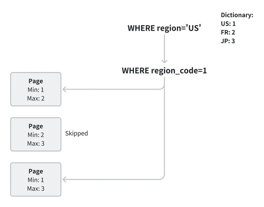 region='US'需要逐字符比較,CPU 熱點函數可能 80-90% 都耗在解析和比較上 - 聚合階段又要基於字符串做哈希和去重,無法利用字典編碼進行優化