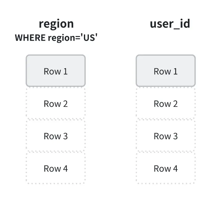 延遲物化的思路正好相反:在初始階段僅使用輕量級的數據結構(例如行號)來表示記錄,在完成所有過濾操作之後,再根據篩選結果去讀取真正需要的列。以 region='US' 為例,StarRocks 會先讀取並過濾 region 字段,僅記錄滿足條件的行號。隨後再按照這些行號讀取 user_id 字段,從而避免無謂的數據加載。
