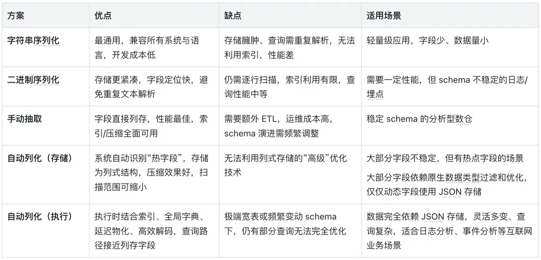 不過,這種方案的實現極具挑戰——系統需要智能地處理異構 schema、 schema 演進等複雜問題。因此,各數據庫產品在這一方向的優化深度差異很大。