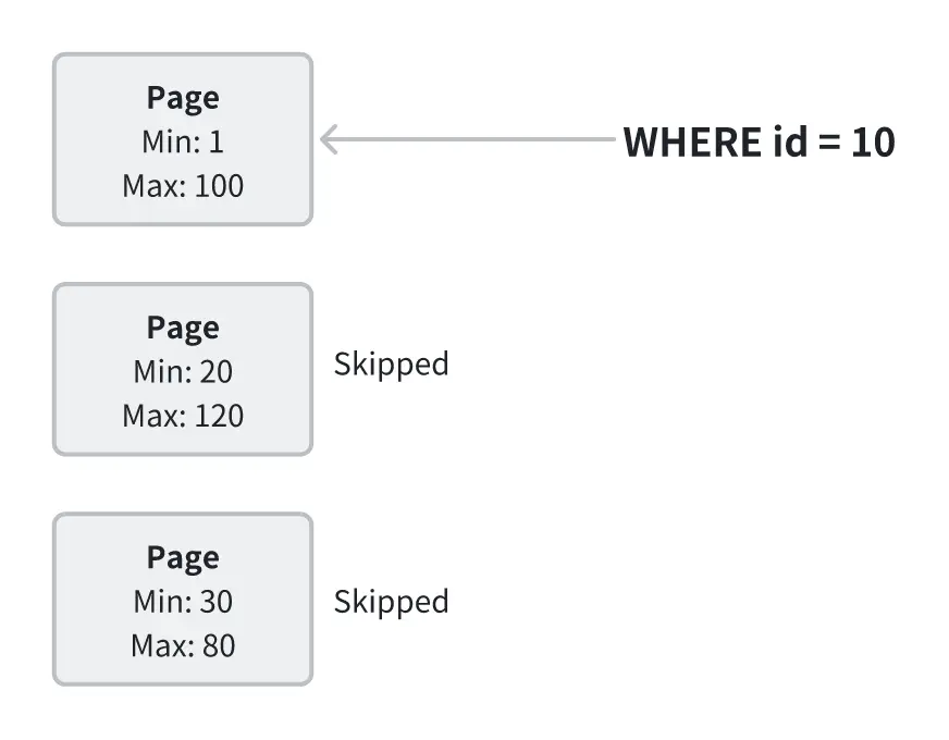 為避免全表掃描,FlatJSON 支持在已列化字段(如 region、event\_time、event\_type)上創建合適的索引,例如 ZoneMap。ZoneMap 會記錄每個 Page 的最小值和最大值,在查詢時可據此快速判斷哪些 Page 可能命中過濾條件,從而跳過無關數據。