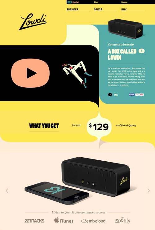 One last website to consider is Lowdi’s. The screenshot below is of the home page. Notice how color is used for both contrast and consistency.