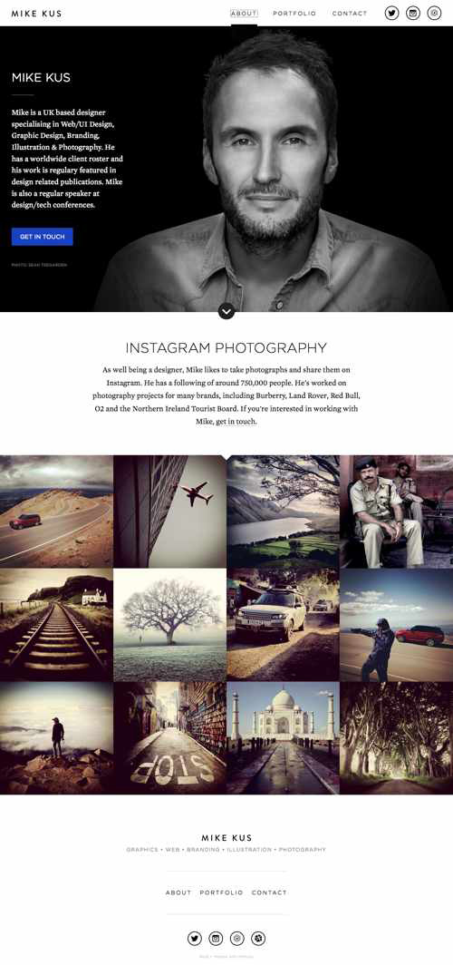Mike’s name as the logo is repeated as the main heading on the page. The header contrasts with the background, as do the backgrounds of the various sections of the page below. Links in the menu share the same uppercase styling. Social icons at the top are repeated along the bottom.