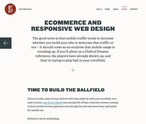 The logo on Electric Pulp’s website is a red circle of moderate size. It contrasts well with everything else that is immediately visible. Notice how the color is repeated in the main navigation to indicate the current page.