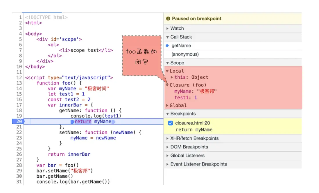 JavaScript 引擎會沿着“當前執行上下文 –> foo 函數閉包 –> 全局執行上下文”的順序來查找 myName 變量。