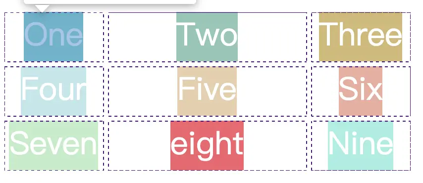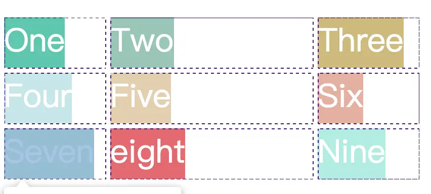 為了儘可能填滿表格,使用 grid-auto-flow: row dense 可以填充上圖中 Three 和 Seven 之間的空白。效果如下所示: