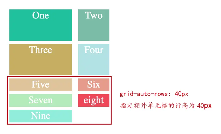 如果實際的單元格數量,超過了由 grid-template-columns 和 grid-template-rows 構成的單元格數量,那麼這些額外單元格的行高、列寬如何約定呢?