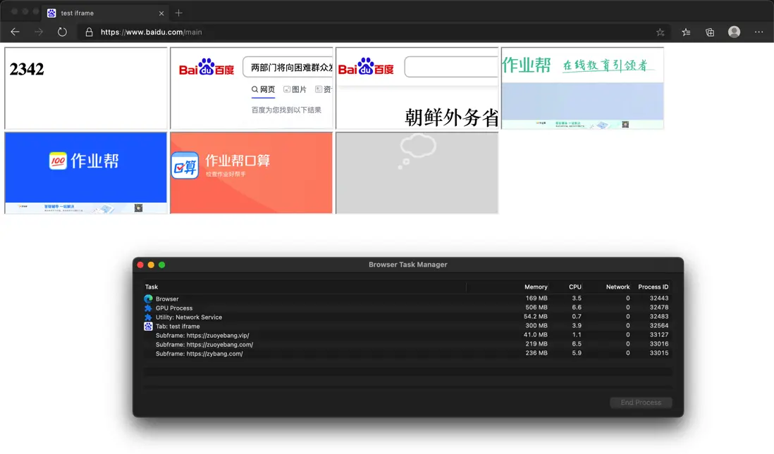 www.baidu.com/main、srcdoc="<h1>2342</h1>"、www.baidu.com/s、mbd.baidu.com - zuoyebang.vip 渲染進程: