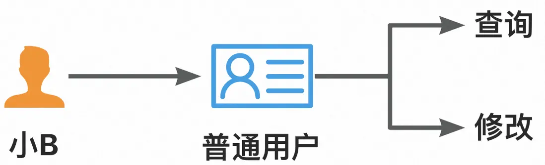 同理,對於小B來説,認證就是小B登錄系統後,會授予普通用户的角色,授權就是授予小B查詢的權限。