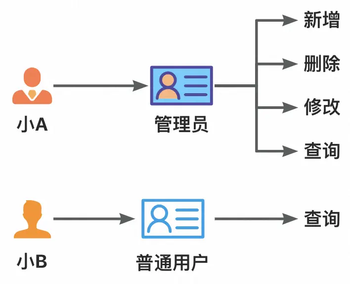 現有兩個用户:小A和小B;兩個角色:管理員和普通用户;4個操作:新增/刪除/修改/查詢。圖例如下:
