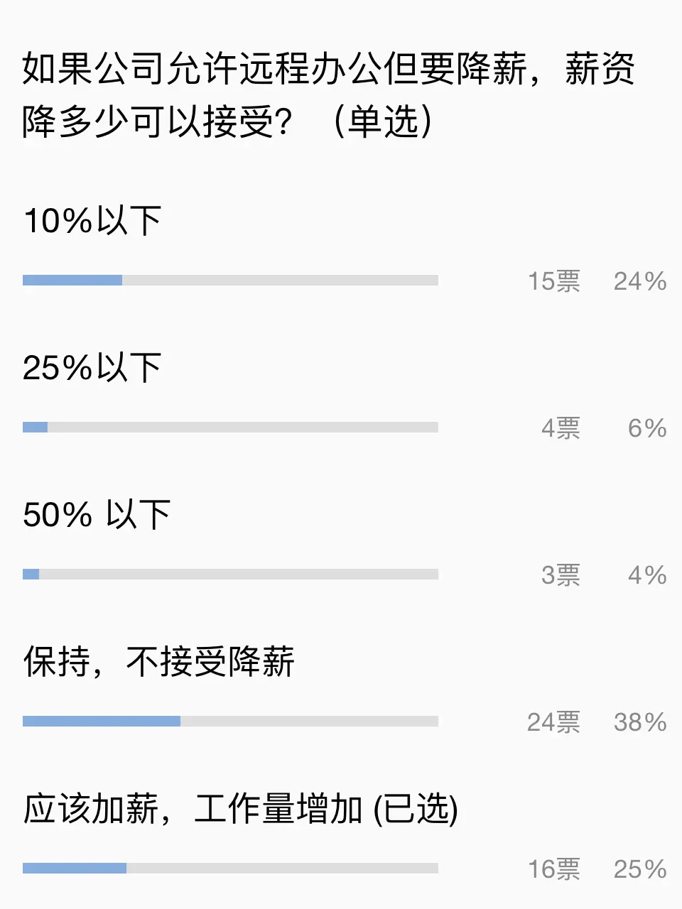 投票結果顯示大多數人更傾向於保持薪資不變或者期望薪資增加,而只有少數人願意接受較小幅度的薪資降低。小編認為公司在決定遠程辦公政策時需要綜合考慮員工的期望和需求。