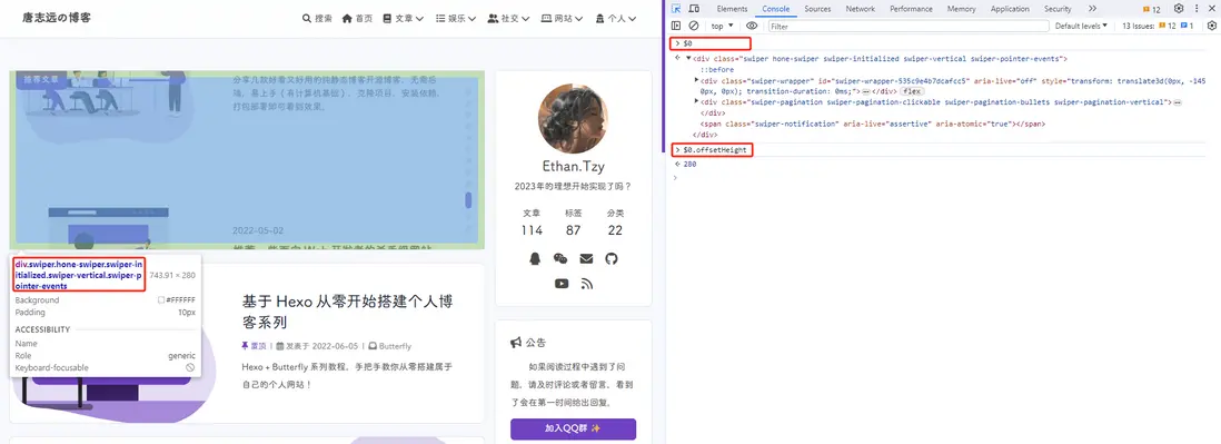 當你通過 Elements 面板 選擇一個元素時,如果想用 JavaScript 打印它的一些屬性,比如寬度、高度、位置等,可以使用 $0 訪問控制枱中的元素。