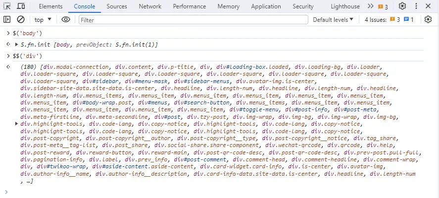 使用 document.querySelector 和 document.querySelectorAll 在控制枱中選擇當前頁面的元素是最常見的需求,單詞太長,我們可以使用 $** 和 **$$ 來代替。