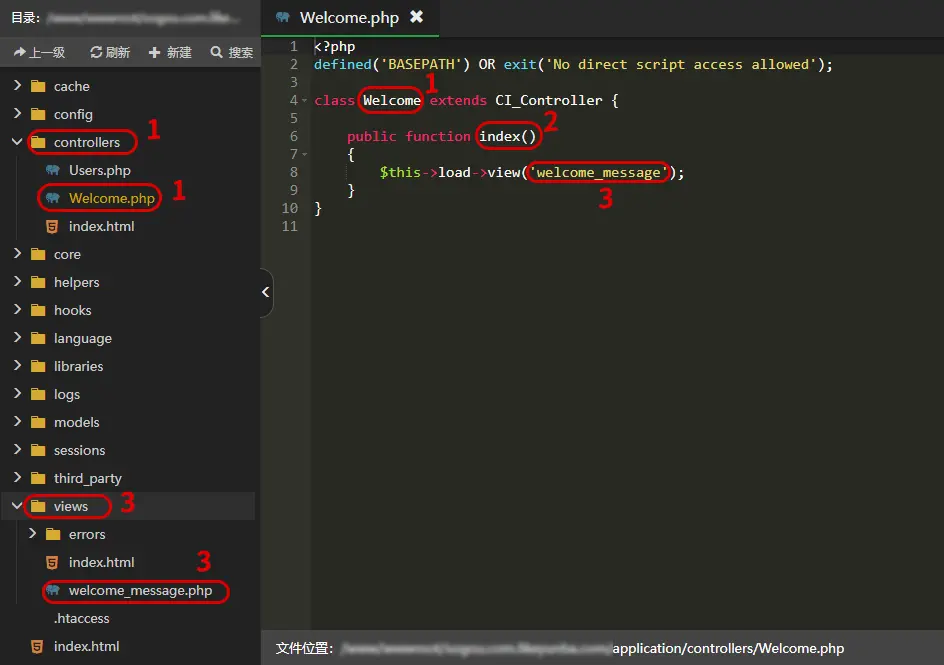 在 application/views 目錄裏有一個 welcome_message.php 就是視圖文件。這就完成了一個最簡單的MVC框架的運行過程,但是這個過程暫時還沒用上M,即 Model,下面會用上。