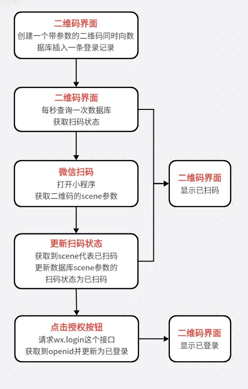 小程序也是具備獲取用户基本信息的能力的,可以調用wx.login接口獲取用户的openid實現登錄。簡單來説就是web端創建一個帶參數的二維碼同時向數據庫插入一條登錄記錄,此時web端已經開始輪詢數據庫這條記錄的掃碼狀態了,微信掃碼後打開小程序並立即獲取到這個參數,然後點擊授權登錄按鈕請求wx.login這個接口獲取到openid,然後將openid更新至數據庫這個登錄記錄中並更新掃碼狀態,web端可以輪詢到登錄成功的狀態碼就展示登錄成功。