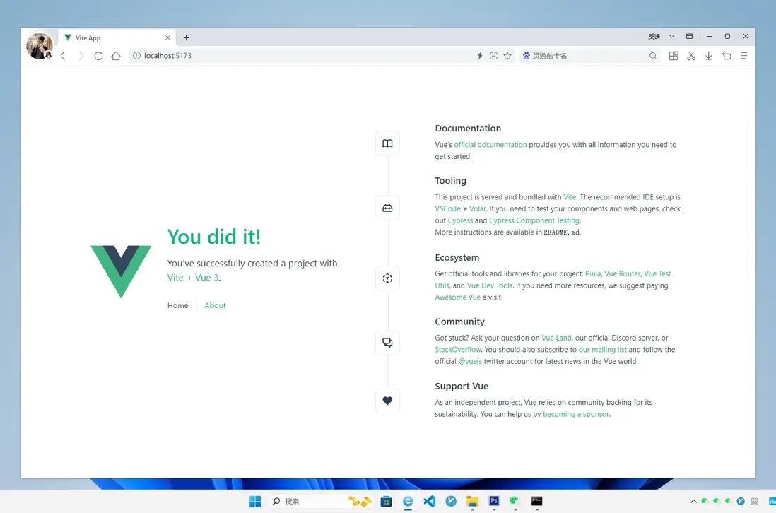 這代表你已經成功搭建了一個 Vue3 項目並運行。