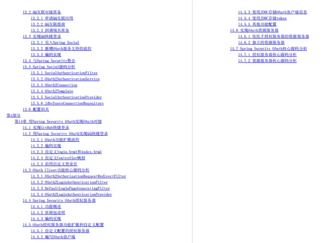 第3部分(第13章)將登錄用户的數據來源從系統內轉移到社交平台,詳細介紹了OAuth,並使用Spring Social整合Spring Security,實現QQ快捷登錄,滿足一般性的項目需求。