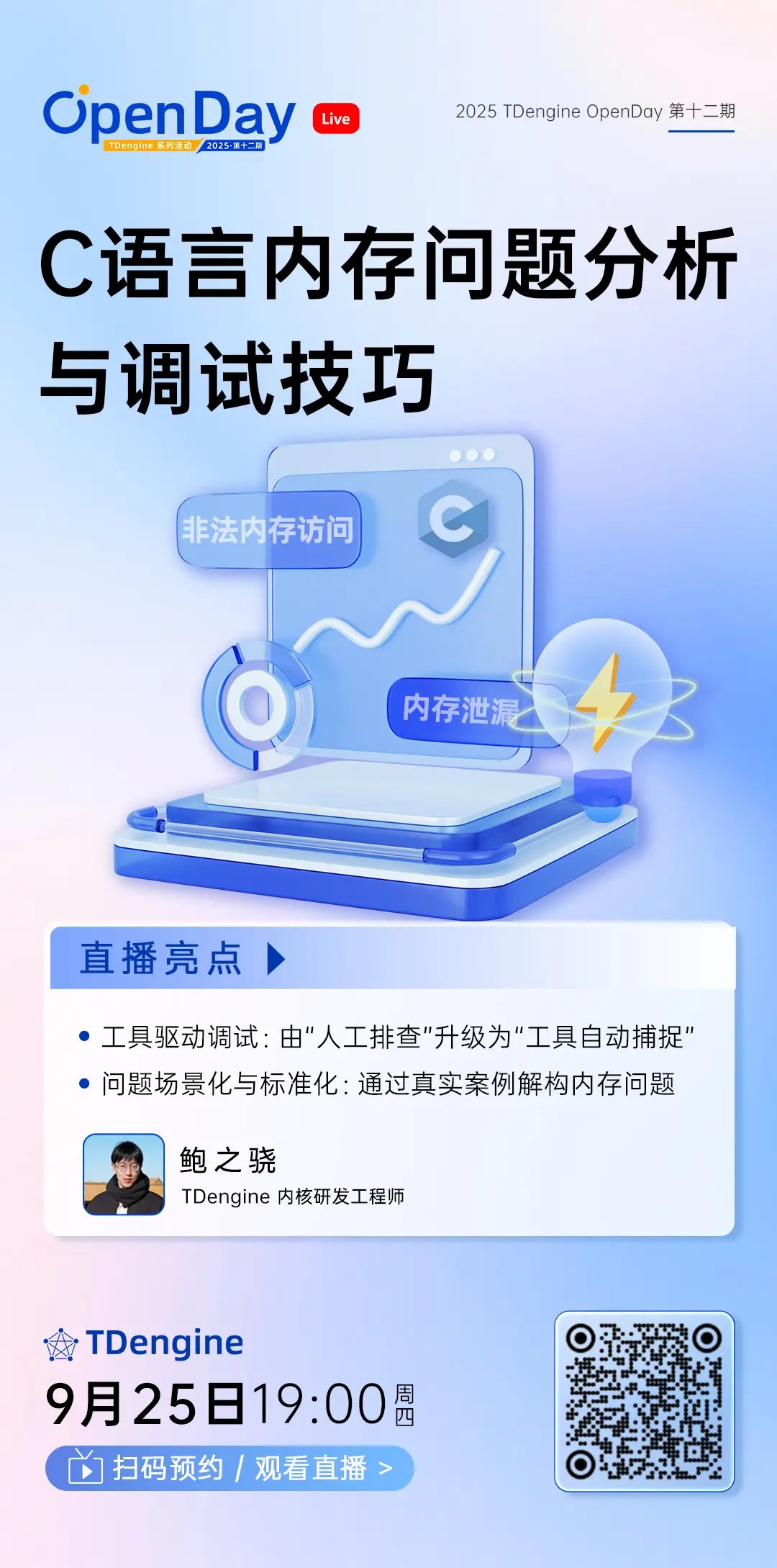 9 月 25 日(週四)19:00TDengine Open Day 直播重磅開啓!本期主題聚焦 《C 語言內存問題分析與調試技巧》,由 TDengine 內核研發工程師 鮑之驍 帶來分享,帶你深入掌握工具化調試方法與標準化預防流程,直擊內存泄漏、越界訪問、內存持續升高等核心議題。