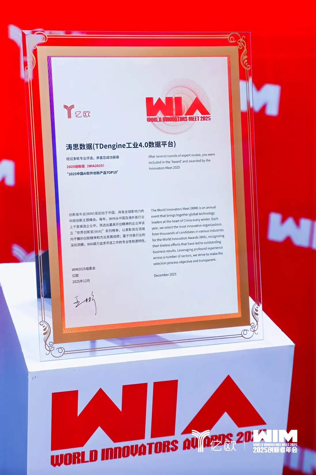 就在近日由億歐主辦的 WIM2025 創新者年會上,這個問題得到了清晰迴應。大會發布了“2025 中國 AI 軟件創新產品 Top10”評選結果,濤思數據基於 TDengine 工業 4.0 數據平台入選這一年度榜單。對一個長期深耕工業數據基礎設施的產品來説,這項認可的意義不在於“AI”,而在於“軟件”與“產業”之間的那條真正可落地的路徑。