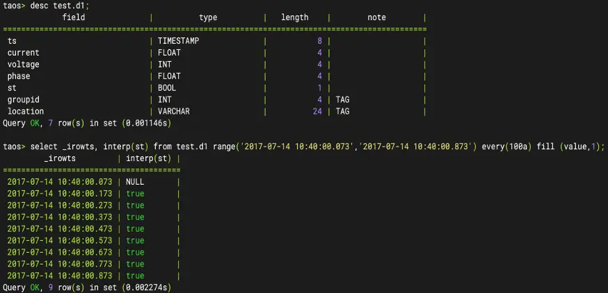 INTERP 函數用於在指定時間斷面獲取指定列的記錄值,當該時間斷面沒有符合條件的行數據時,會根據 FILL 參數自動進行插值。在 2.x 版本中,該函數尚不支持對 BOOL 類型數據的插值,而在 3.0 版本中,這一限制已被優化,現可對 BOOL 類型字段執行插值操作: