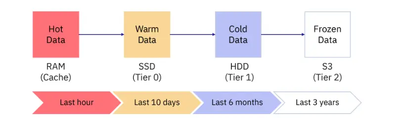 - 温數據(Warm Data):存儲在 SSD(Tier 0)上,涵蓋最近 10 天內的數據。相比熱數據,温數據的訪問頻率較低,但仍需較快的讀取速度。