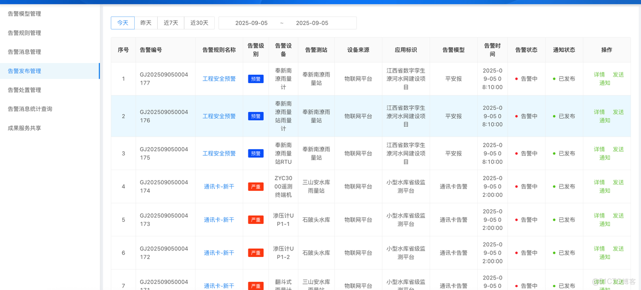 告警發佈管理模塊能夠全要素記錄並實時推送告警信息,涵蓋告警編號、規則名稱、級別、涉及設備/測站、時間、狀態及通知情況,並支持“查看詳情”“發送通知”等操作,串聯起“告警觸發—信息發佈—人員響應”的閉環流程。