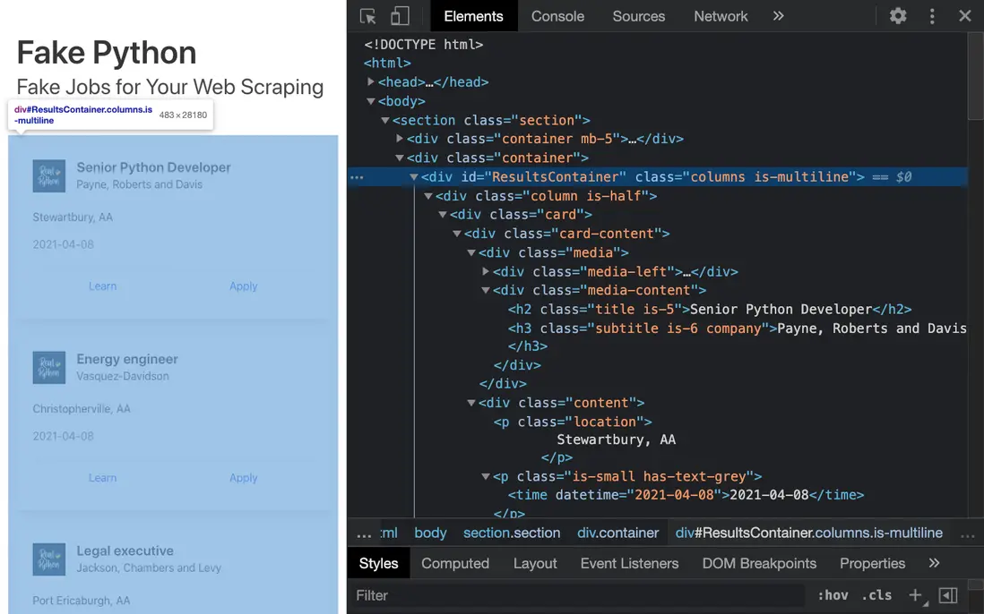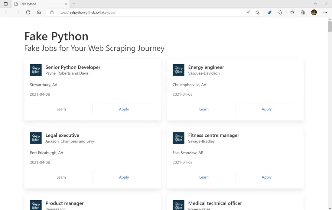 在開始編寫 Python 代碼前,合格的程序員還是需要具備基礎的網頁知識。在這裏打開教程中所使用的網頁:https://realpython.github.io/fake-jobs/