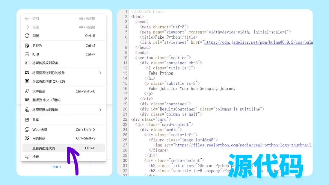 右鍵點擊“查看頁面源代碼”,打開後將展示網頁的 HTML 代碼。