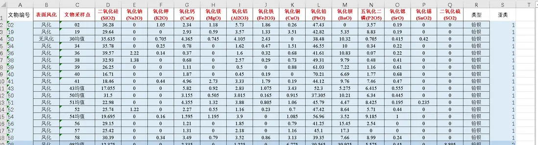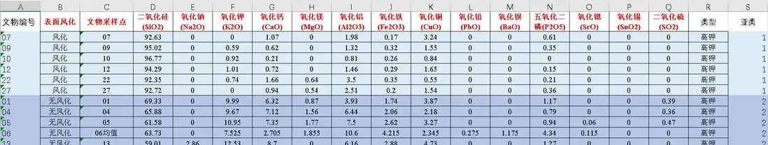 | 文物編號 | 類型 | 表面風化 | 二氧化硅(SiO₂)實測值 | 二氧化硅預測值 | 氧化鋇(BaO)實測值 | 氧化鋇預測值 | 氧化鉛(PbO)實測值 | 氧化鉛預測值 |