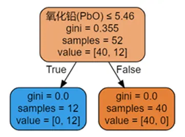 核心結論:氧化鉛(PbO)是最關鍵的分類指標——當PbO含量<5.46時,判定為高鉀玻璃;當PbO含量≥5.46時,判定為鉛鋇玻璃,模型訓練集與測試集準確率均為100%。