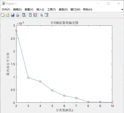 clc;clear;A = importdata('gaojia.txt');data=mapminmax(A,0,1);[n,p]=size(data);K=10;D=zeros(K,2);for k=2:K[lable,c,sumd,d]=kmeans(data,k,'dist','sqeuclidean');sse1 = sum(sumd.^2);D(k,1) = k;D(k,2) = sse1;endplot(D(2:end,1),D(2:end,2))hold on;plot(D(2:end,1),D(2:end,2),'or');title('不同K值聚類偏差圖') xlabel('分類數(K值)') ylabel('簇內誤差平方和')
