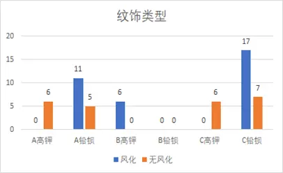 下圖為“類型+紋飾”組合與風化的關聯柱形圖,可明確:(高鉀,紋飾A)、(高鉀,紋飾C)均未風化,(高鉀,紋飾B)均風化,(鉛鋇,紋飾A/C)大部分風化。