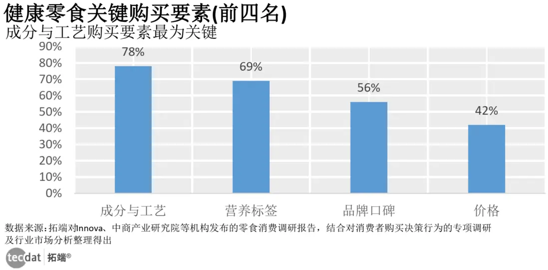 - 關鍵購買要素:78%優先關注“配料表簡潔度+製作工藝(如非油炸)”,69%查看“能量、脂肪、鈉含量”等營養數據,56%傾向“有報告背書、評價好的品牌”,42%對比“單價與規格”,性價比仍是重要考量。