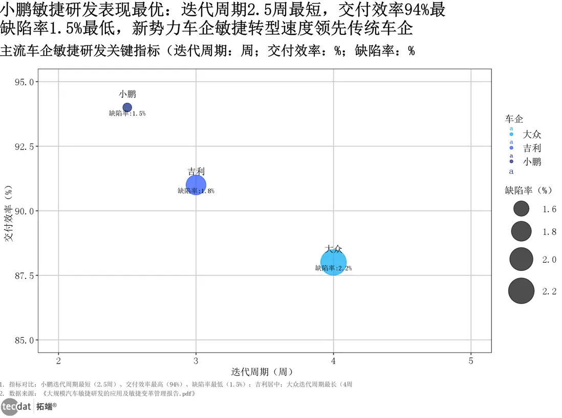 | 敏捷研發 | 迭代週期(周) | 小鵬(2.5周) | 3.3周 | 《大規模汽車敏捷研發的應用及敏捷變革管理報告》 |