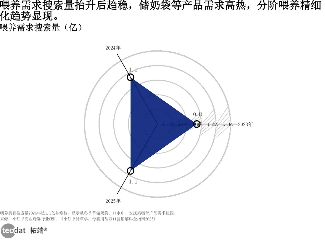 3秒解讀:餵養搜索量2023-2024年漲37.5%,2024-2025年持平,細分品類中“儲奶袋”“分階奶瓶”需求爆發,傳統品類下滑。