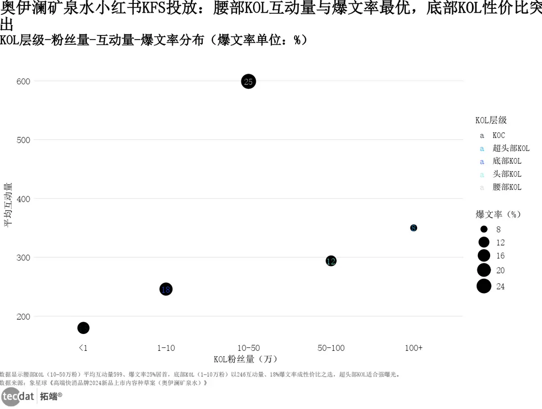 做快消新品的同事,是不是都遇過這種糟心事兒:把70%預算砸給100萬粉以上的超頭部KOL,最後互動量寥寥,爆文率還不到10%?奧伊瀾礦泉水2024年推新品時也踩過這個坑,後來他們把KOL按“超頭-頭部-腰部-底部-KOC”分層,算了筆細賬,結果發現之前忽略的腰部KOL才是“寶藏”——這就是下面這張氣泡圖的核心發現。