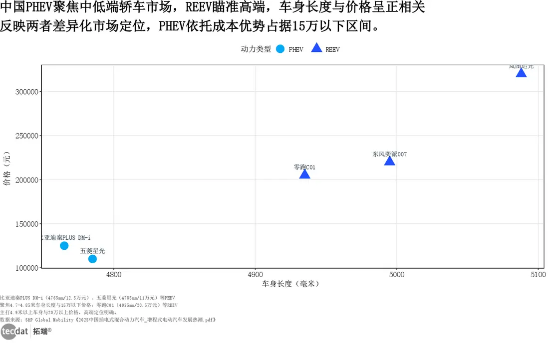 這種“高低配”分化在數據維度尤為清晰,下圖散點圖顯示:PHEV車型均集中於“4.7-4.85米車身+15萬元以下”區間,REEV車型則全部落在“4.9米以上車身+20萬元以上”區間,市場定位界限明確。