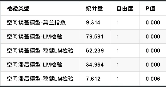 - LM檢驗:用於判斷是否存在空間效應,結果如下表所示,空間誤差模型與空間滯後模型的檢驗統計量均顯著拒絕原假設,説明數據存在顯著空間效應,需構建空間面板模型。