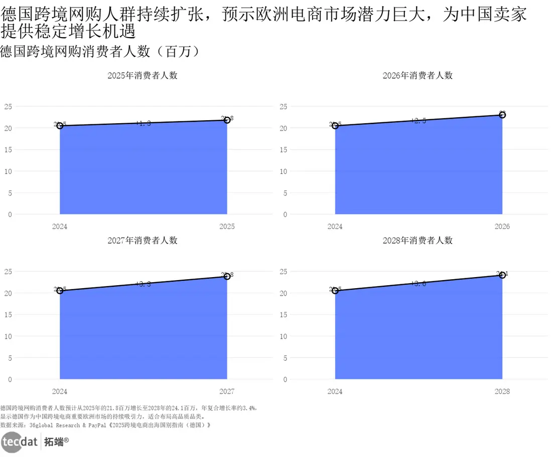 2025-2028年,德國跨境網購消費者將從21.8百萬增至24.1百萬,年複合增長率3.4%,這個增長不是“泛泛的增量”,而是集中在“品質化、場景化”需求——比如冬季保暖類產品,消費者願為“環保材質+經典設計”多付20%溢價。