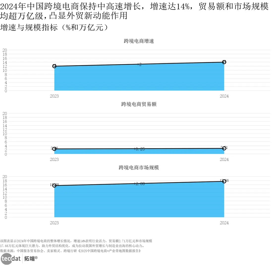 | 跨境電商市場規模 | 2024年商品進出口總額口徑2.71萬億元 | 2024年全市場規模口徑17.66萬億元 | 統計口徑不同,差額為服務類等其他收入 | 報告1聚焦商品進出口,報告2涵蓋全產業鏈收入(含物流、服務等) |