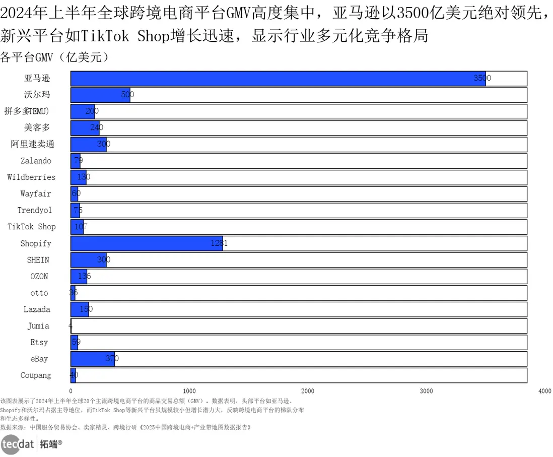 全球跨境電商平台呈現“頭部壓艙、新興破局”的態勢:亞馬遜以3500億美元GMV穩居第一,Shopify靠獨立站生態拿下1281億美元,沃爾瑪500億美元緊隨其後;而TikTok Shop憑藉“短視頻種草+貨架電商”模式,107億美元GMV背後是翻倍的增速,成為不少中小賣家的“起量新選擇”。