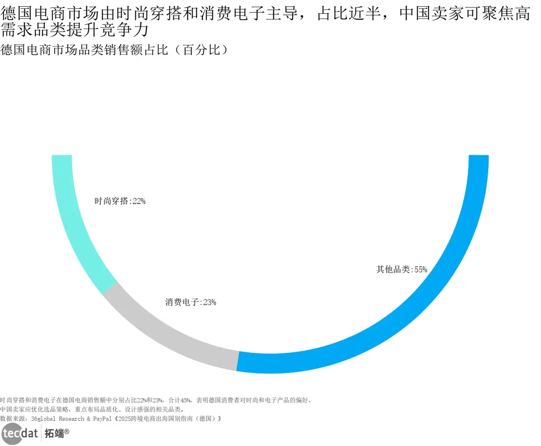 德國電商市場的“錢袋子”主要在兩大品類:時尚穿搭佔22%、消費電子佔23%,合計45%的份額,相當於“做好這兩類,就抓住德國市場近半機會”。但要注意,時尚類需突出“環保材質(如有機棉)、經典款(避免快時尚)”,消費電子需強調“功能複合(如帶烘乾的洗衣機)、AI賦能(如智能掃地機器人)”。