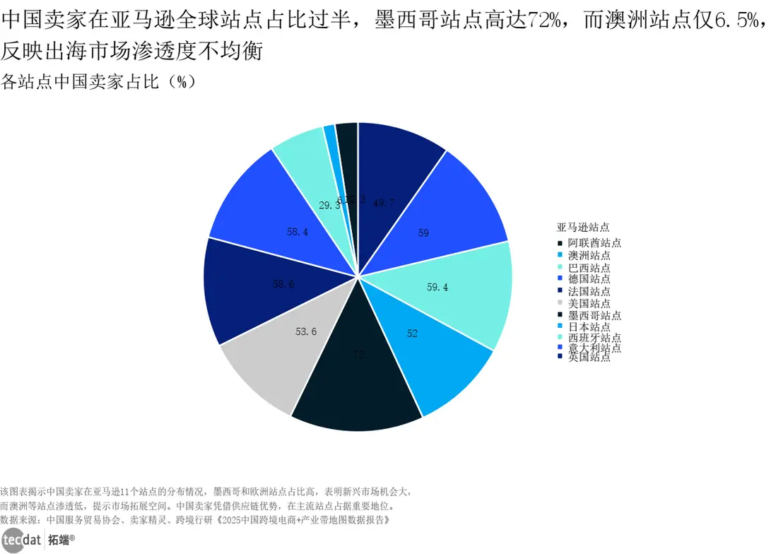 中國賣家在亞馬遜各站點的佔比差距顯著:墨西哥站點72%的佔比,意味着“中國供應鏈+本地化運營”的組合在新興市場更易起量;而澳洲站點僅6.5%的佔比,説明這裏仍有未被挖掘的藍海,但需突破物流時效瓶頸。